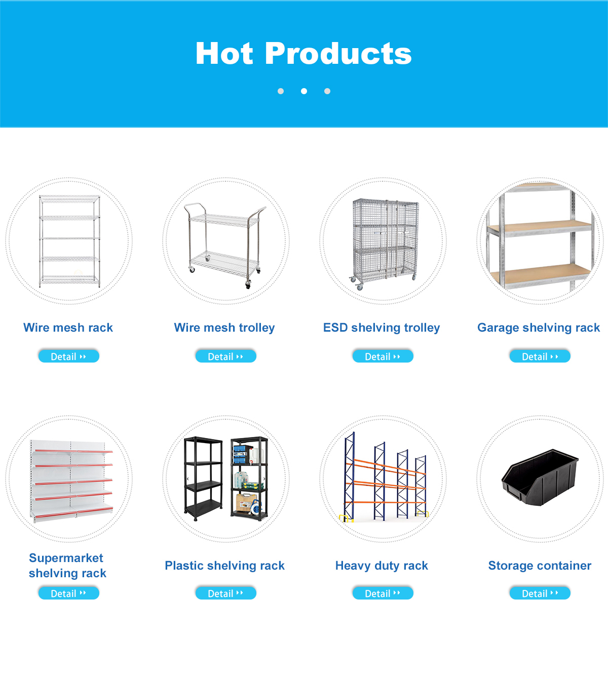Productos principales:Estantería de alambre, estante de metal, estante de supermercado, estante de paleta de almacén, carrito